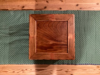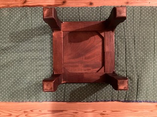 もともと、四周に框がまわったちゃぶ台で、框から足につながるあたりの細工は趣があります。そのあたりを残すために、框の中央部分を切り取って、各辺の真ん中で継ぎ直してもらっています。天板はべこべこだったのですが、よいところを切り取って再利用してもらっています。